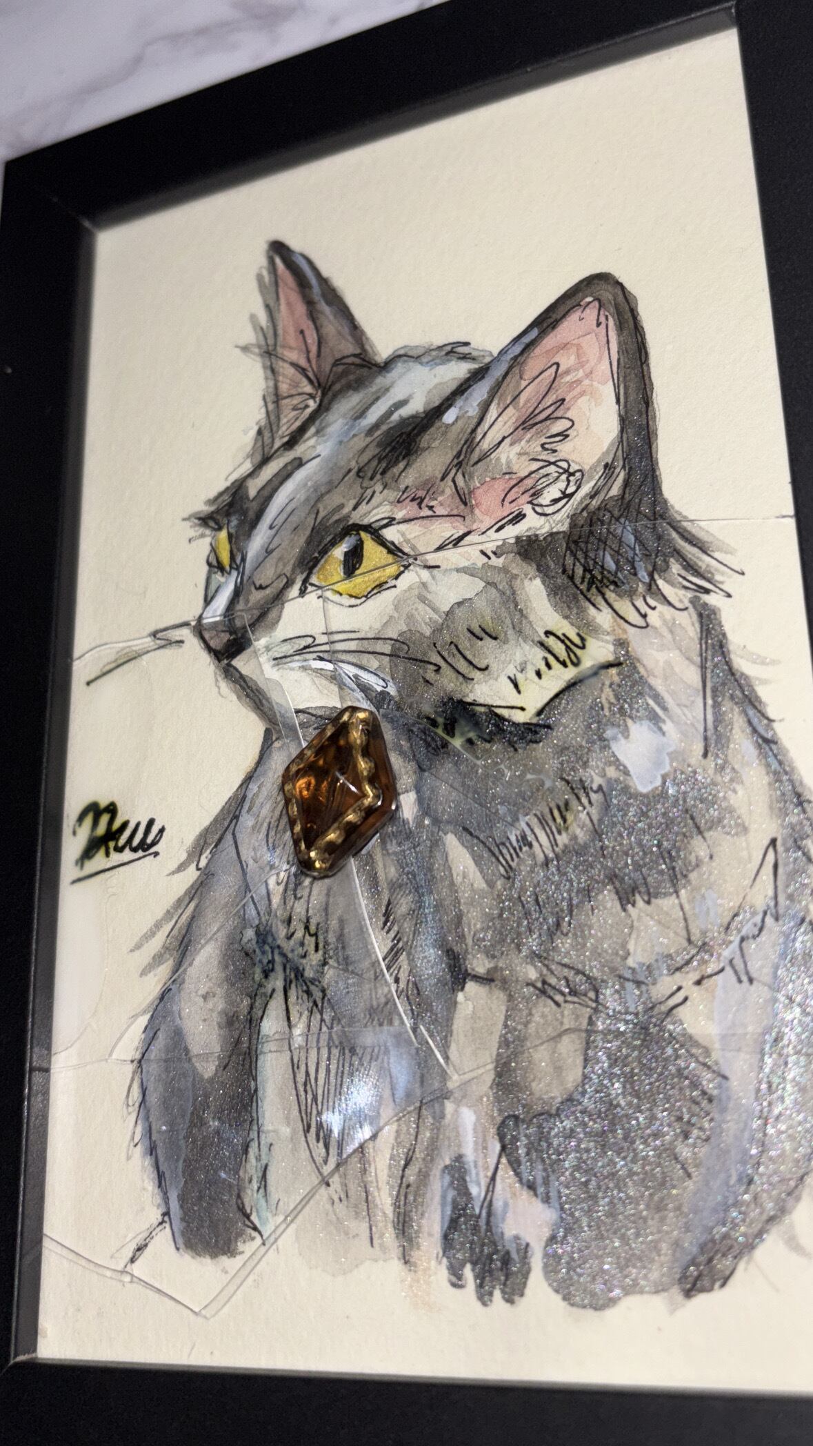孤独を抱えるこの黒猫は、周りにも誰にも合わせられないプライドの高い猫。周りと接してみたくて、仲良くなりたくて自分のプライドを心の中で割らなきゃと思い心の中で割りました。でも現実ではうまく割れずにいます。なので目から下はフィルムが割れていますが目から見える現実の部分は、割れていません。いつか誰かと仲良く一緒に暮らせる事を願ってます。同じ境遇の方がいたら是非お迎えしてください。きっと仲良くなれます。